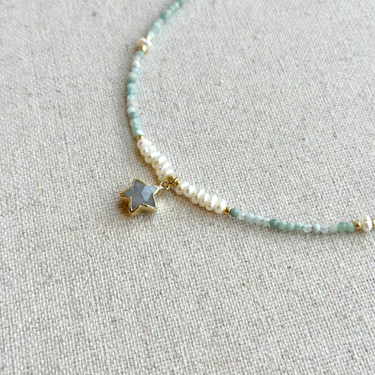 Star-shaped Moonstone And Amazonite With Freshwater Pearl Beaded Necklace