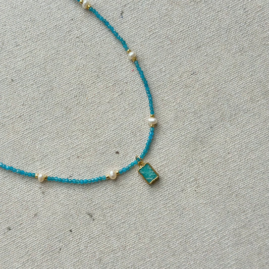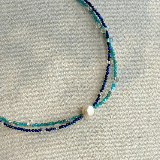 • Freshwater Pearl And Lapis Mixed Apatite Beaded Double Layer Necklace