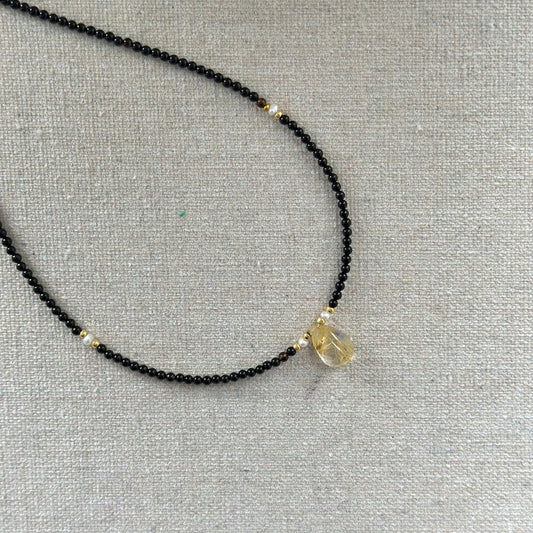Black Onyx And Golden Rutilated Quartz Beaded Necklace