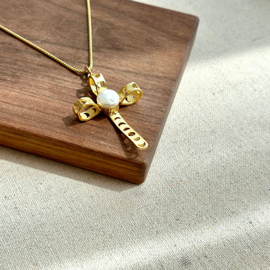 Freshwater Pearl Cross Pendant Rope Chain Long Gold-plated Necklace