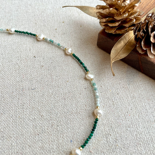 Malachite And Amazonite With Freshwater Pearl Beaded Choker Necklace