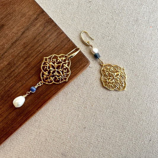 Oriental Floral Freshwater Pearl And Sodalite Gold-plated Earring
