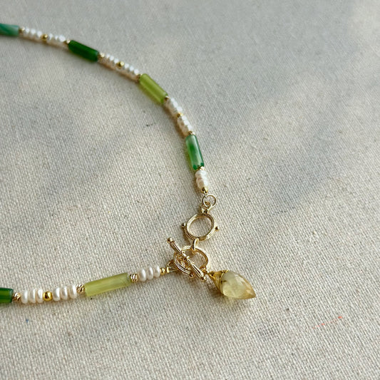 Prehnite And Agate Mixed Freshwater Pearl Beaded Hoop Toggle Necklace
