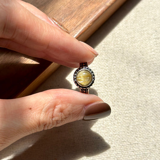 Round Golden Rutilated Quartz Adjustable Sterling Silver Ring