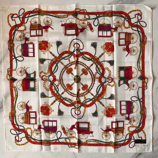 CELINE PARIS Vintage White Chariot Printed Handkerchief