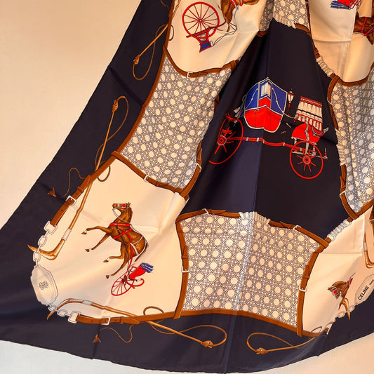 CELINE PARIS Vintage Navy And White Chariot Printed Scarf