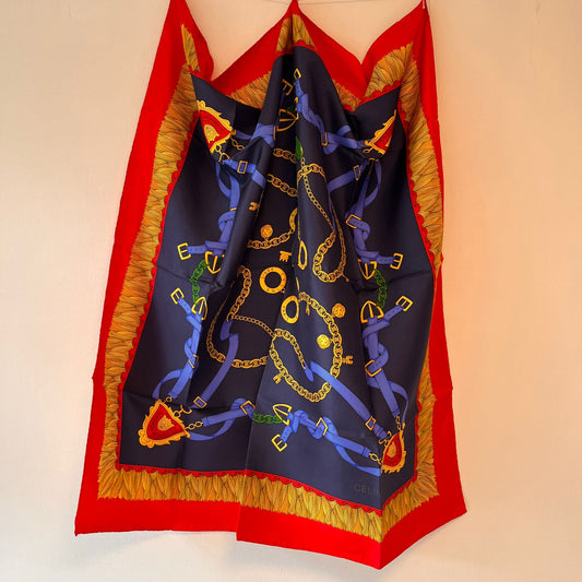 CELINE PARIS Vintage Red And Navy Jewelery Printed Vintage Scarf