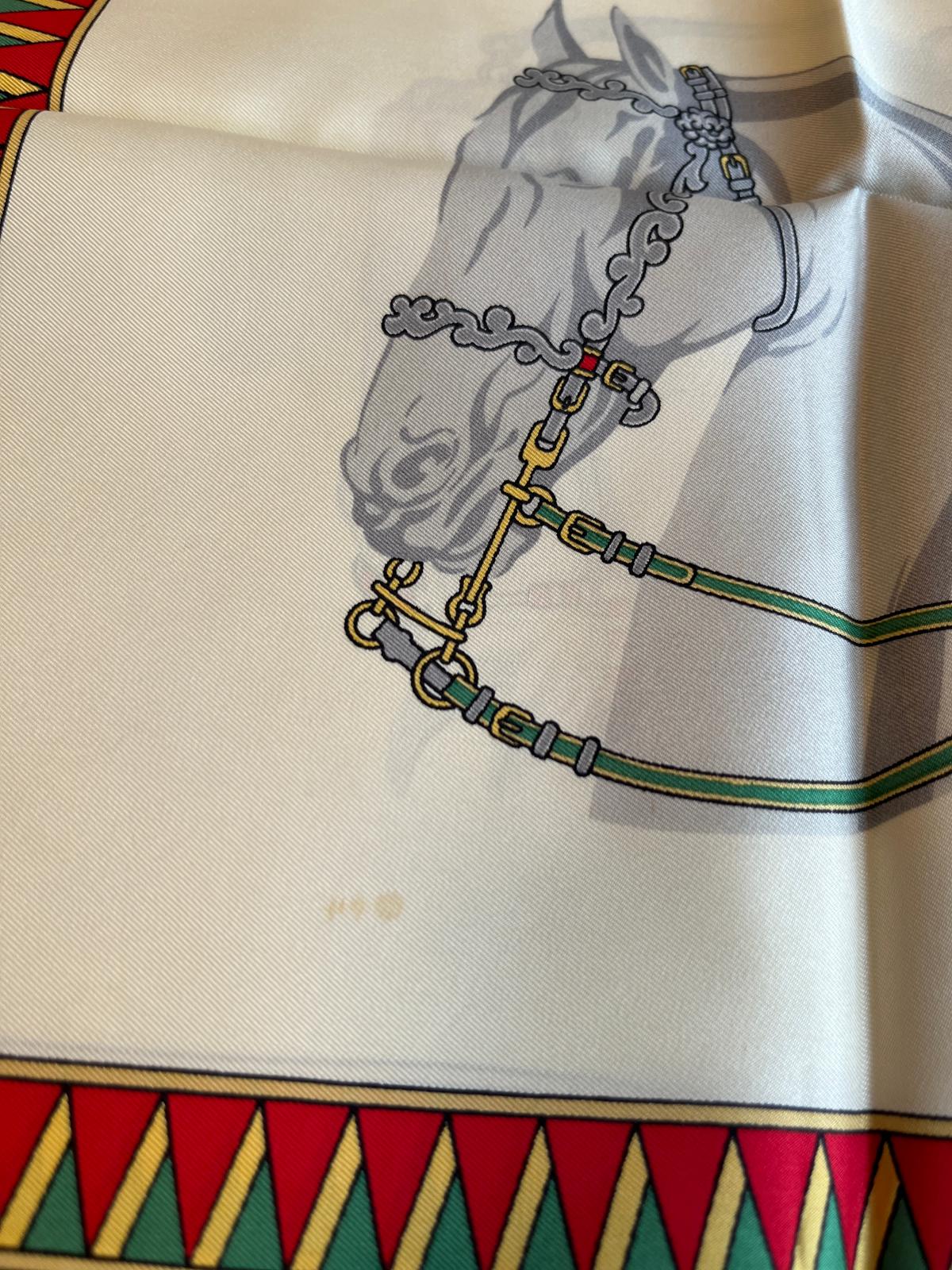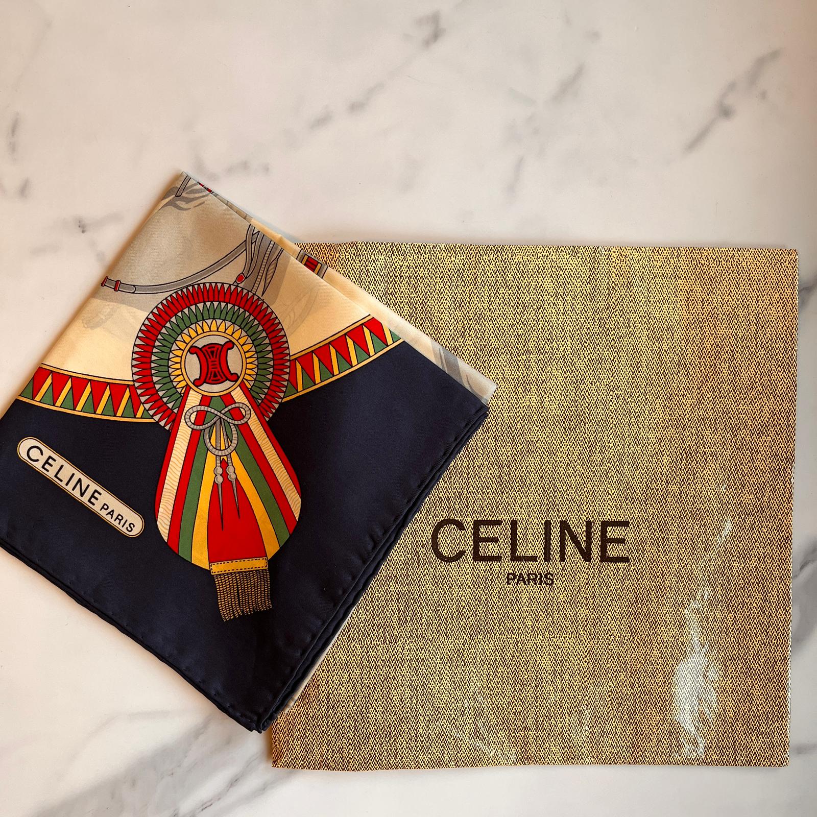 - Details: Celine vintage scarf in navy and white. Decorated with horse carriage patterns.