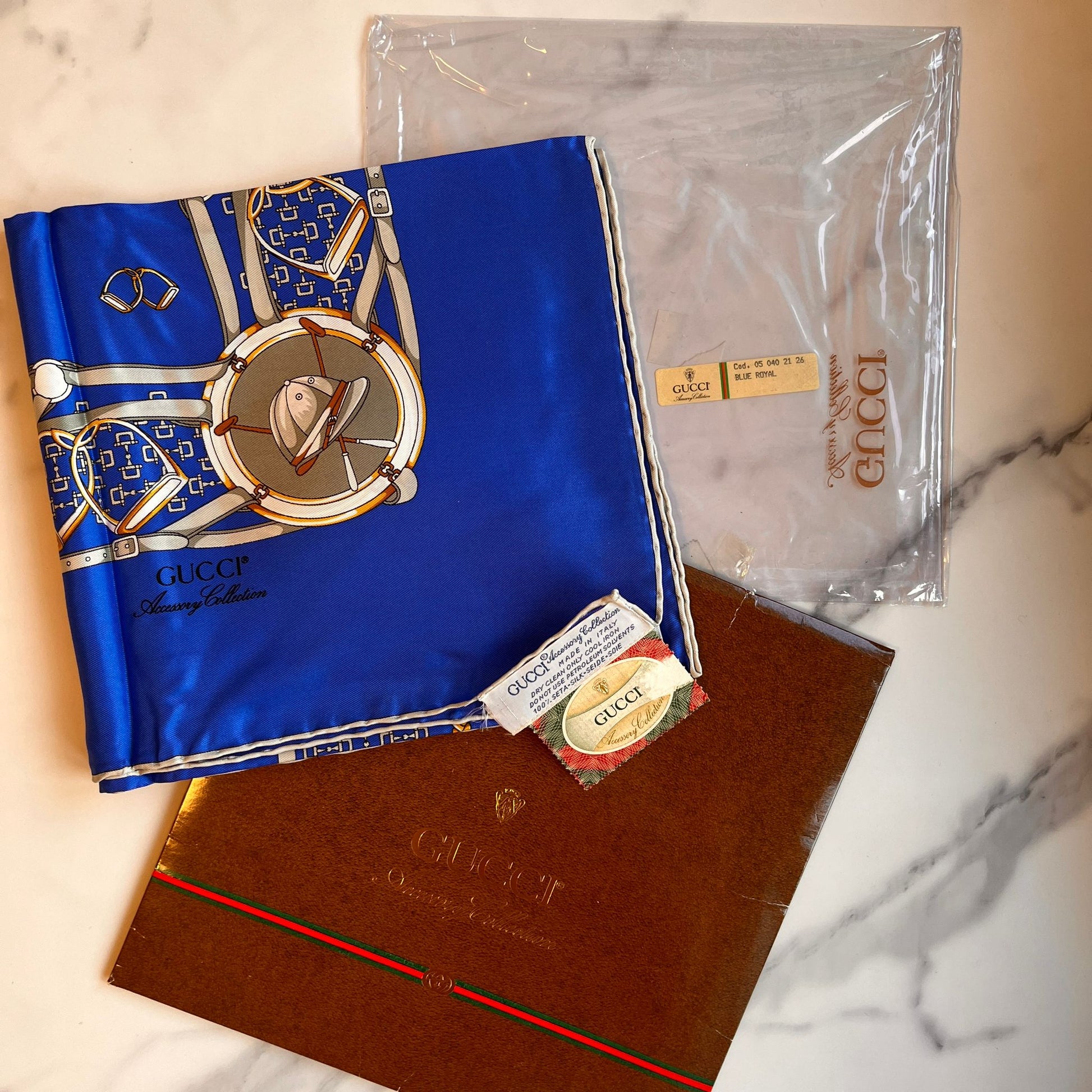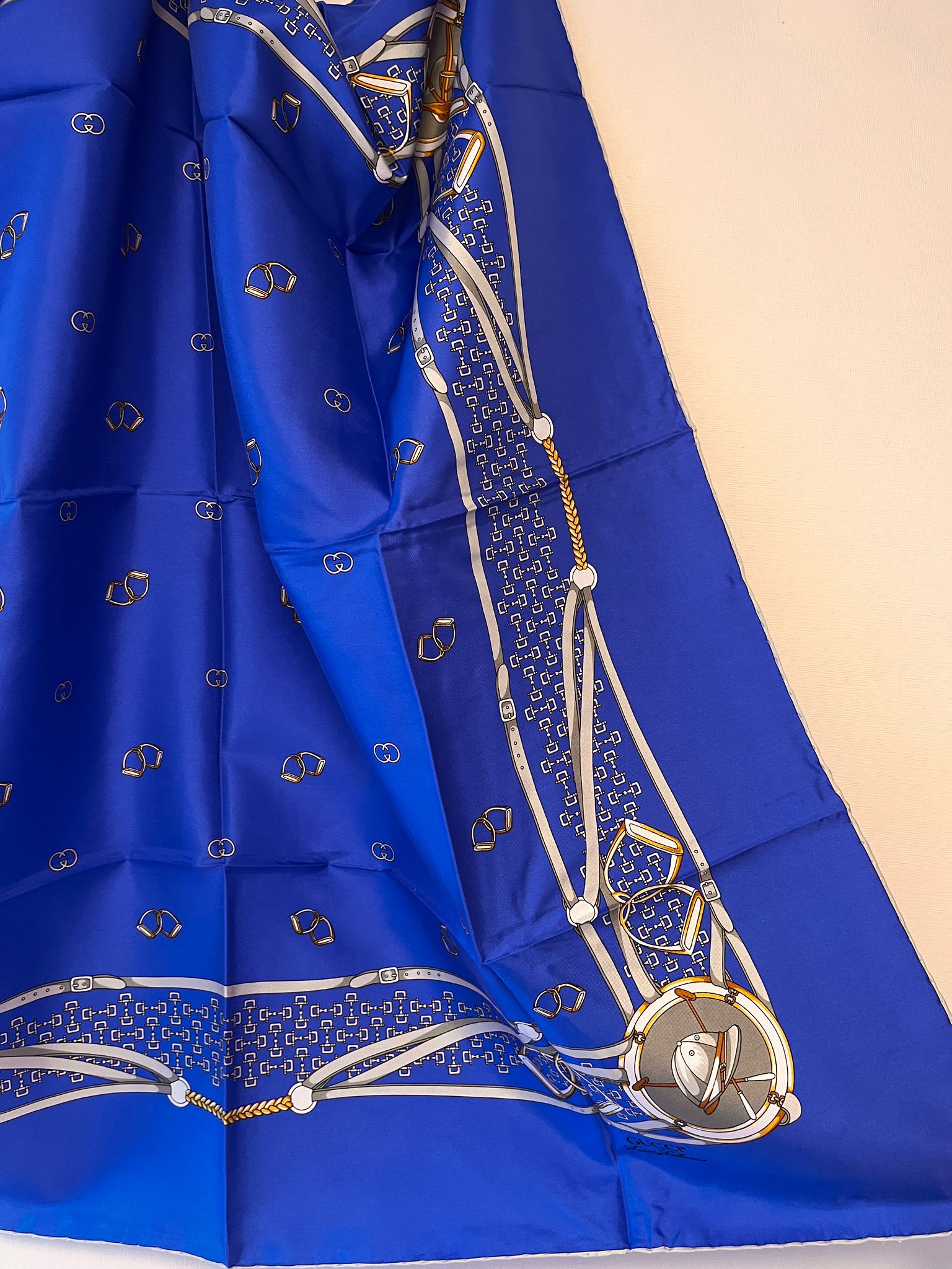 - Details: Gucci vintage scarf in blue. Decorated with helmets & buckles pattern